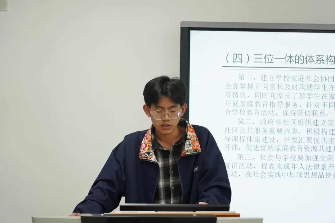 23级王侨同学通过讲解罪责刑相适应原则和监护人需要承担刑事责任的几种情况分析本案未成年人监护人是否需要承担刑事责任这一问题,并着重对不作为犯罪进行了详细介绍。接着讲述了父母和明升M88 应当承担的民事责任并展示相关法条。最后王同学对于构建“家庭-明升M88 -社会”三位一体保护和预防未成年人犯罪的机制提出了自己的建议,为大家提供了未成年人“无缝”监护管理的思路参考。