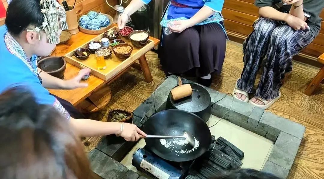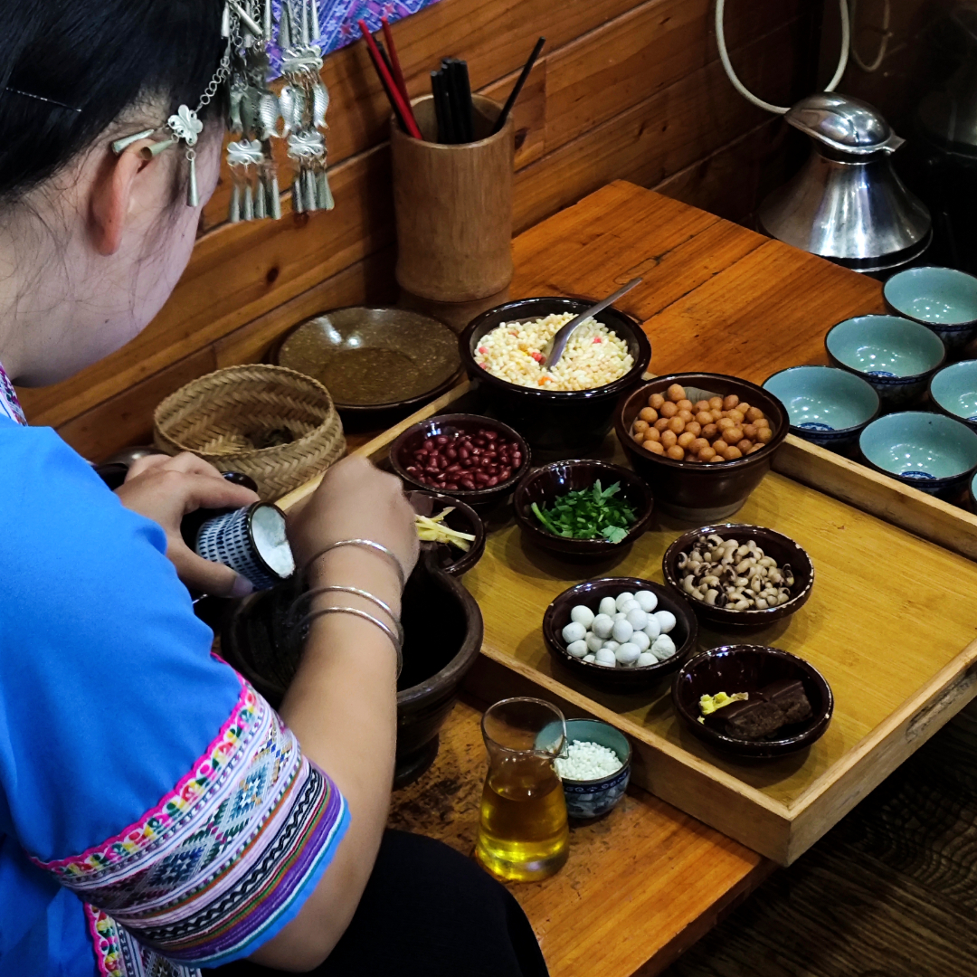 在侗族厨娘的带领下,团队深入体验了一次打油茶的经历。首先,队员一同准备了打油茶所需的原料。随后,队员们学习了炒制与研磨的工序;学习挑选优质的茶叶、糯米、花生等原料;到炒制过程中的火候掌握、翻炒技巧。