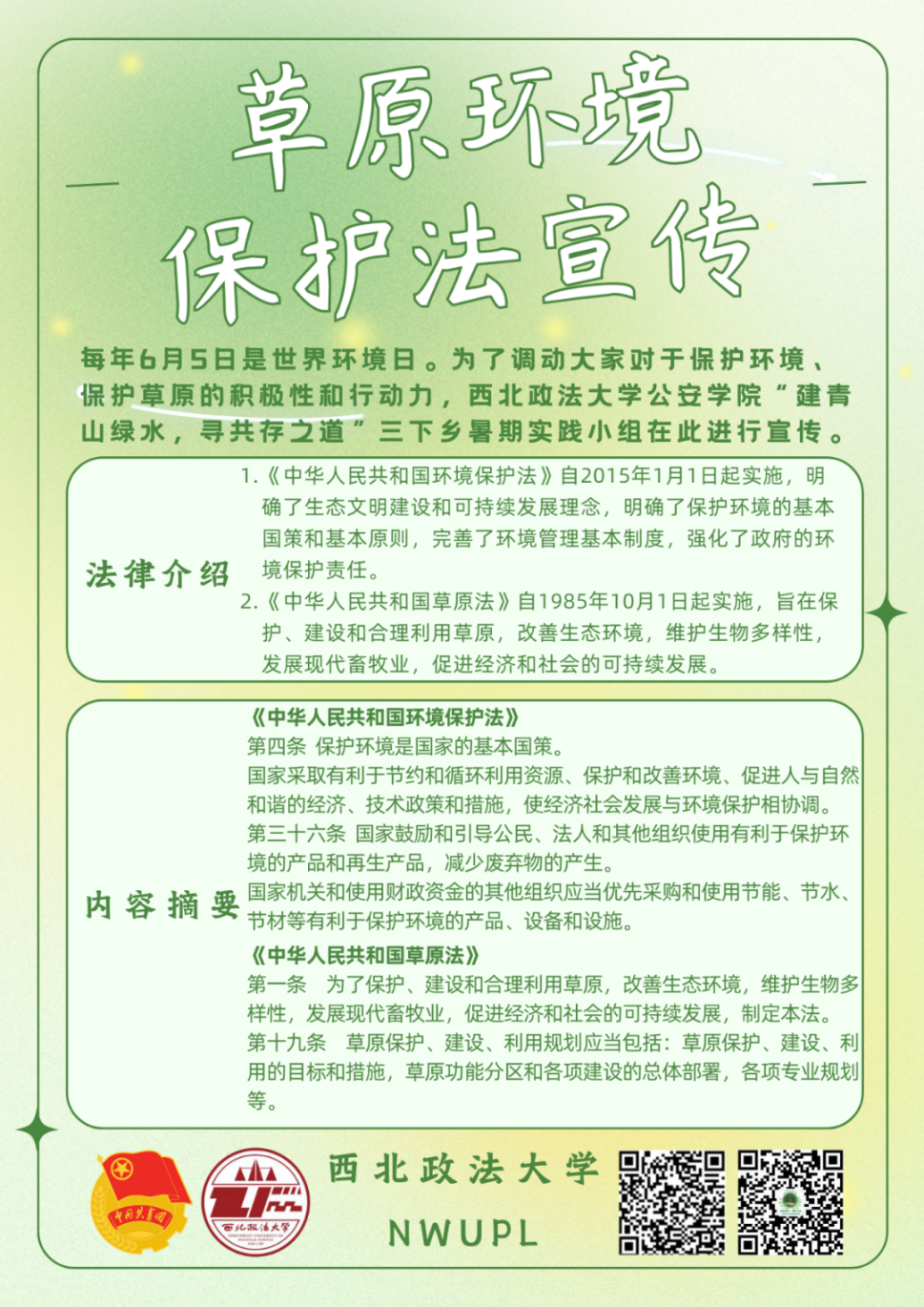 为深入学习贯彻习近平生态文明思想,践行“绿水青山就是金山银山”的理念,明升M88 明升M88 青寻“治沙造氧”生态保护实践小组联合多伦县气象局开展“建青山绿水 寻共存之道”主题普法宣讲活动,宣讲内容为《中华人民共和国环境保护法》和《中华人民共和国草原法》。