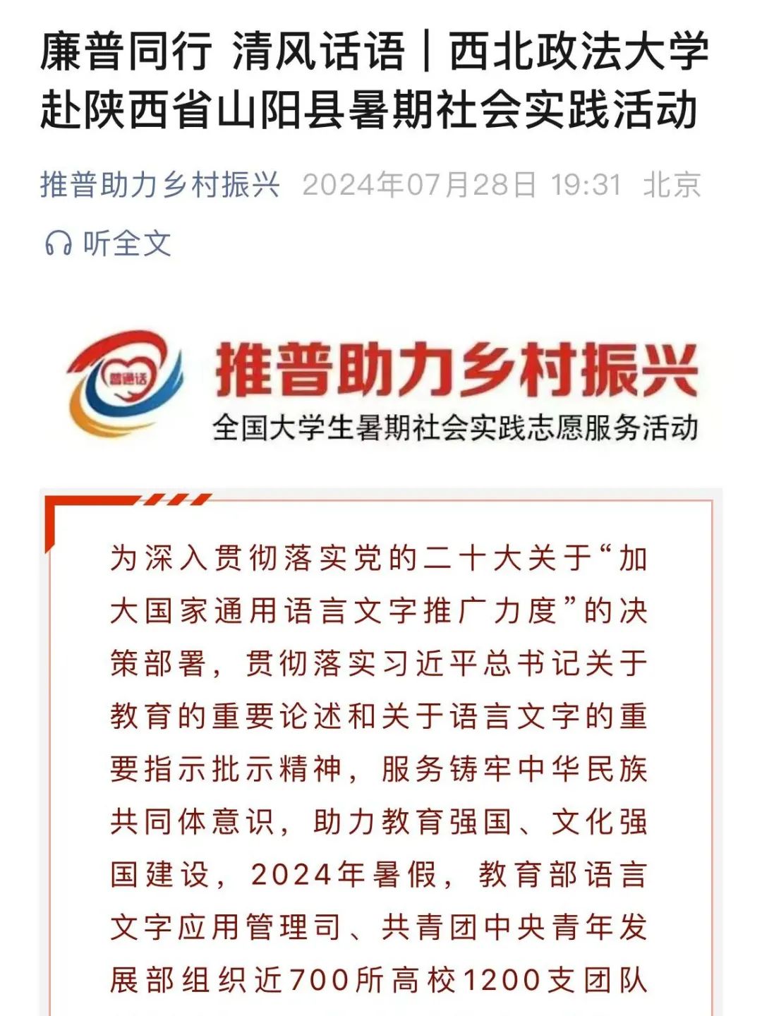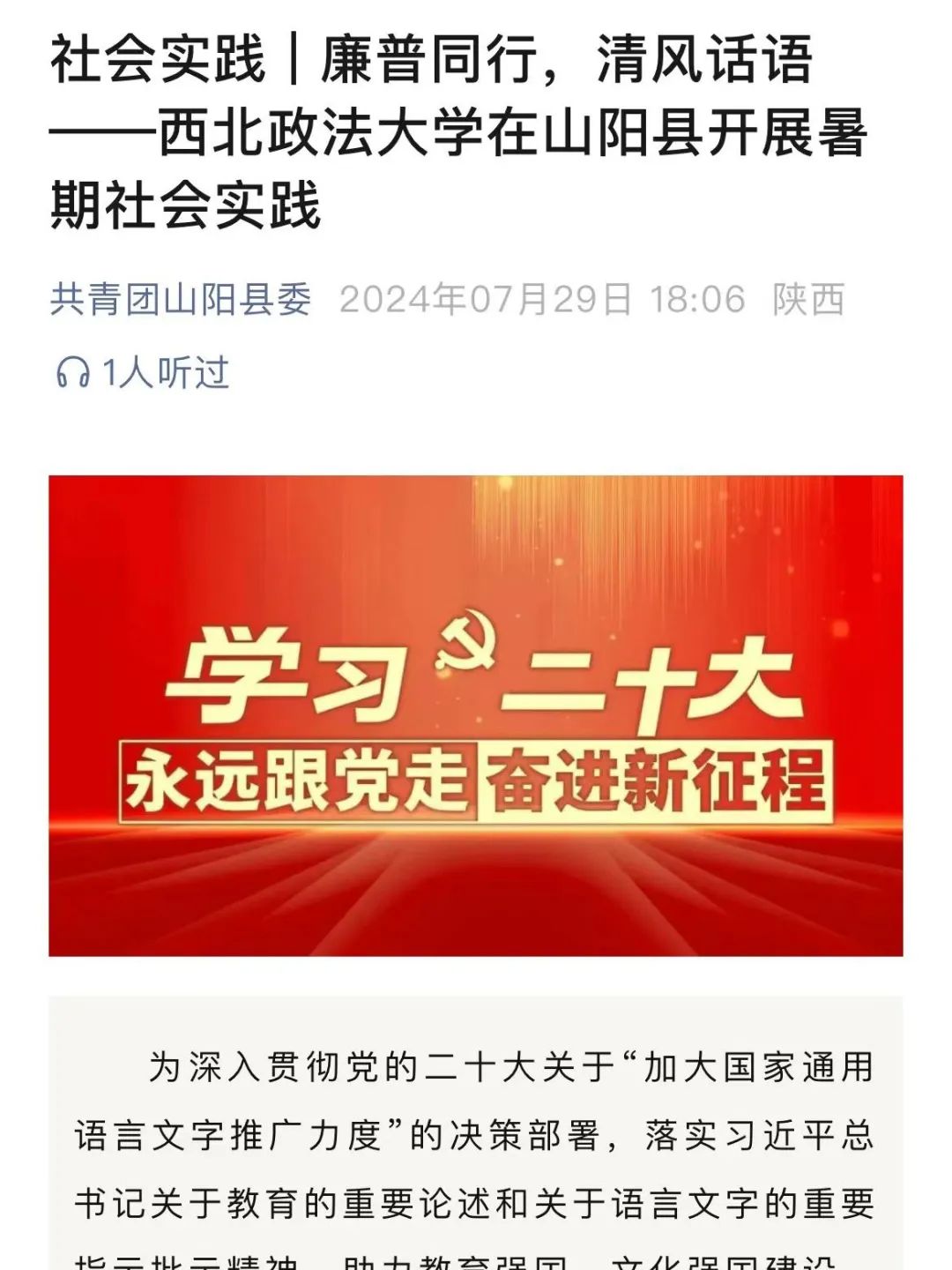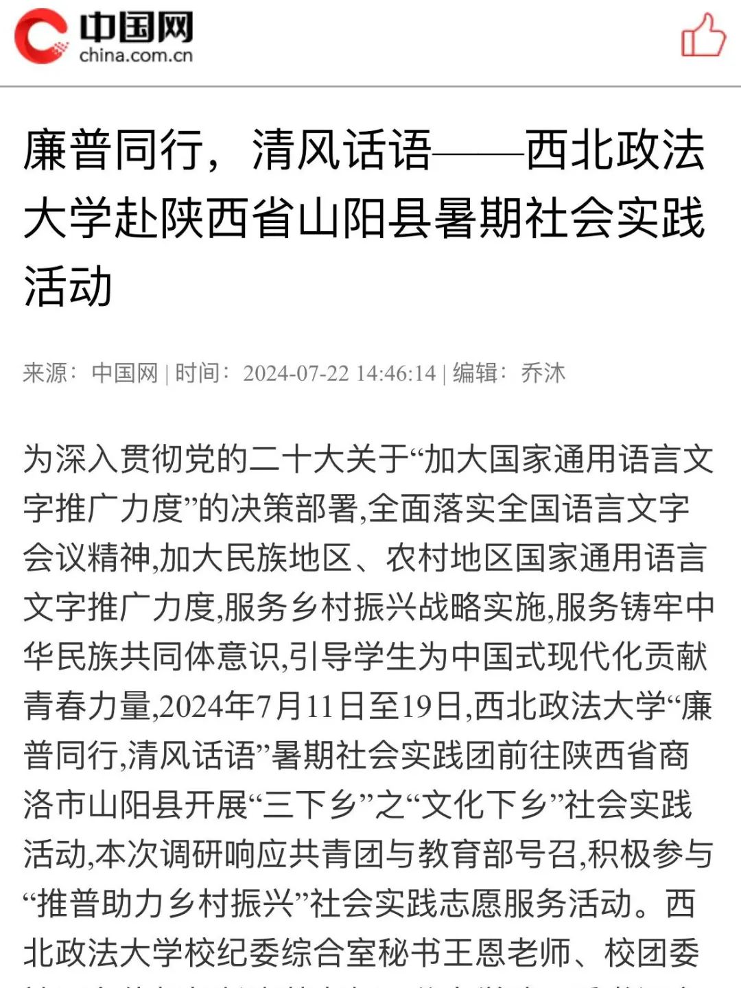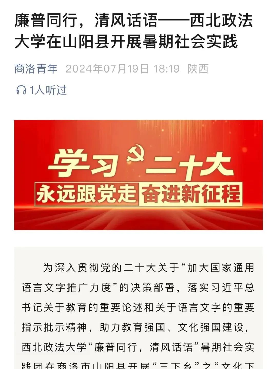 明升M88 “廉普同行,清风话语”实践队在商洛市山阳县开展“三下乡”之“文化下乡”社会实践活动,积极参与“推普助力乡村振兴”社会实践志愿服务活动。明升M88 校纪委综合室秘书王恩、校团委社团文体部部长张革、明升M88 团委书记方宁、外国语明升M88 王莎莎指导实践活动开展。本次活动受到中国网、商洛青年、推普助力乡村振兴、共青团山阳县委等多家媒体的关注和报道。