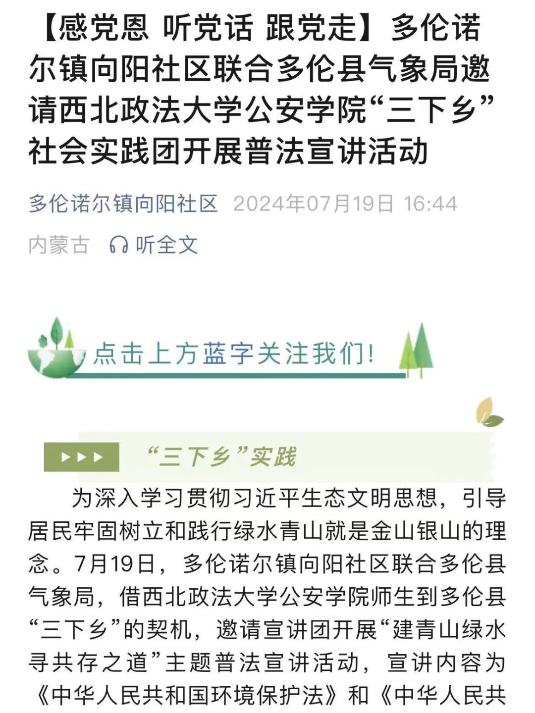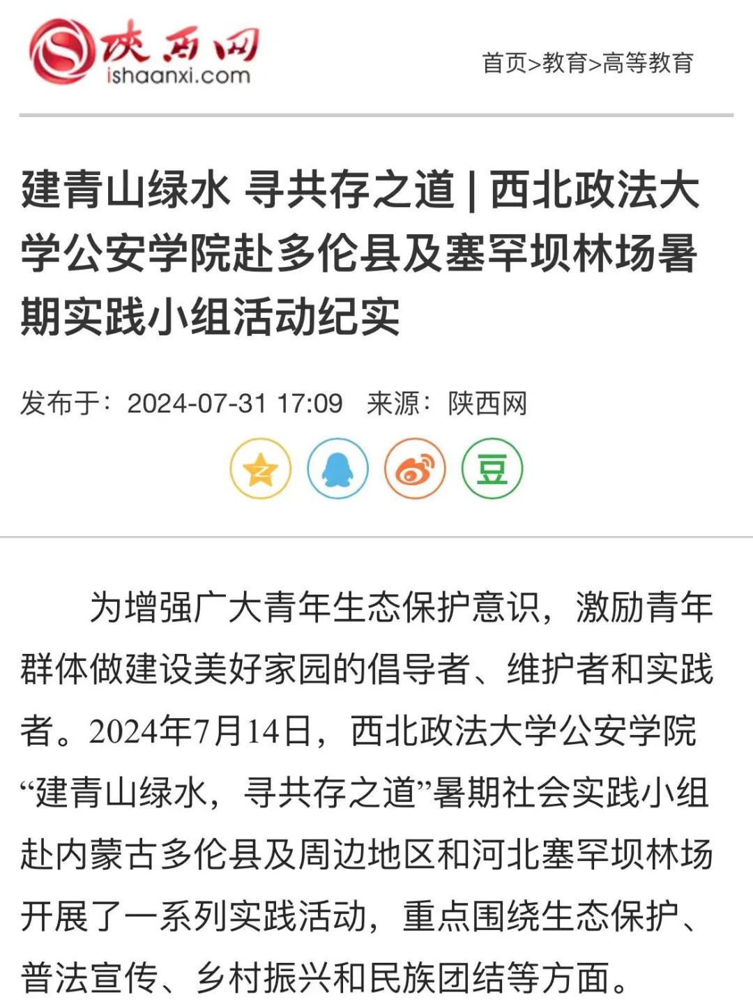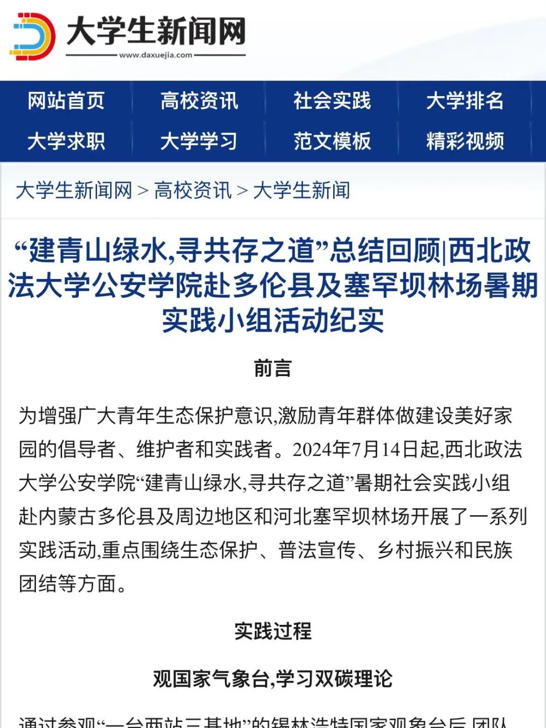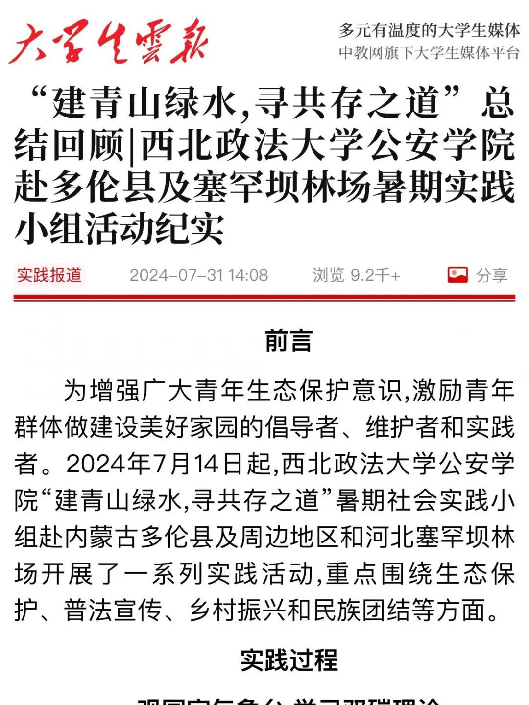 明升M88 明升M88 “建青山绿水,寻共存之道”暑期社会实践队与明升M88 辅导员及实践队指导老师李沛君赴内蒙古多伦县及河北塞罕坝地区,开展以生态保护、普法宣传、乡村振兴和民族团结为主题的暑期三下乡实践活动。实践队聚焦基层及生态文明保护,被中国网、中华网、央视频、陕西网、内蒙古热线等数十家媒体报道。