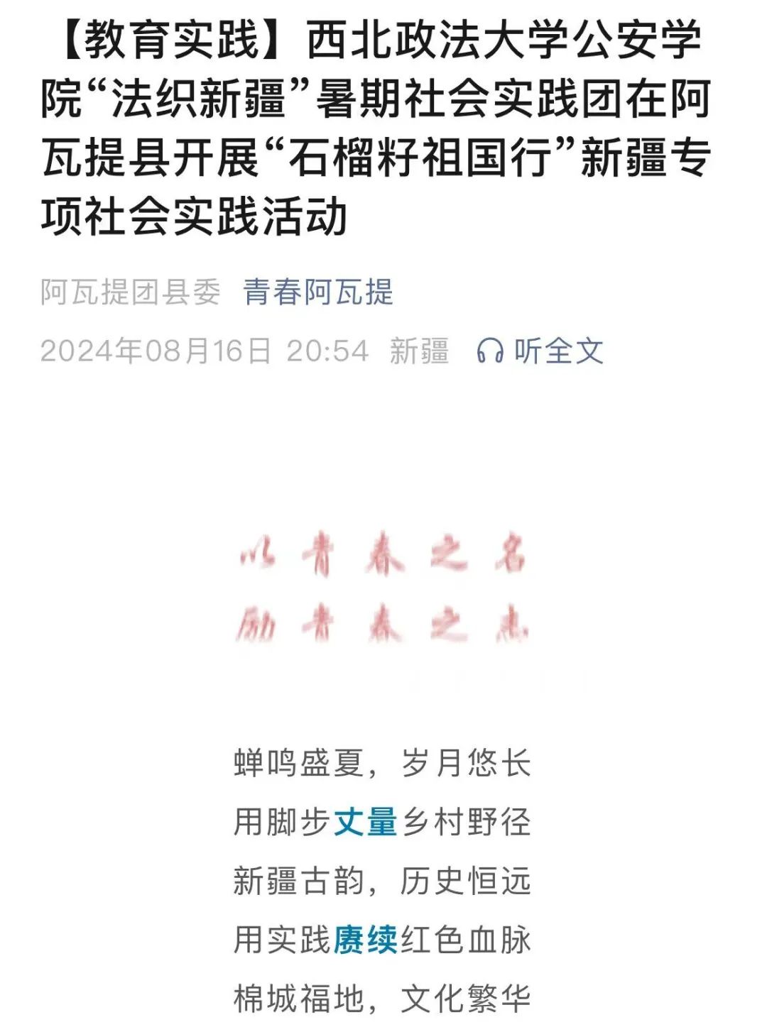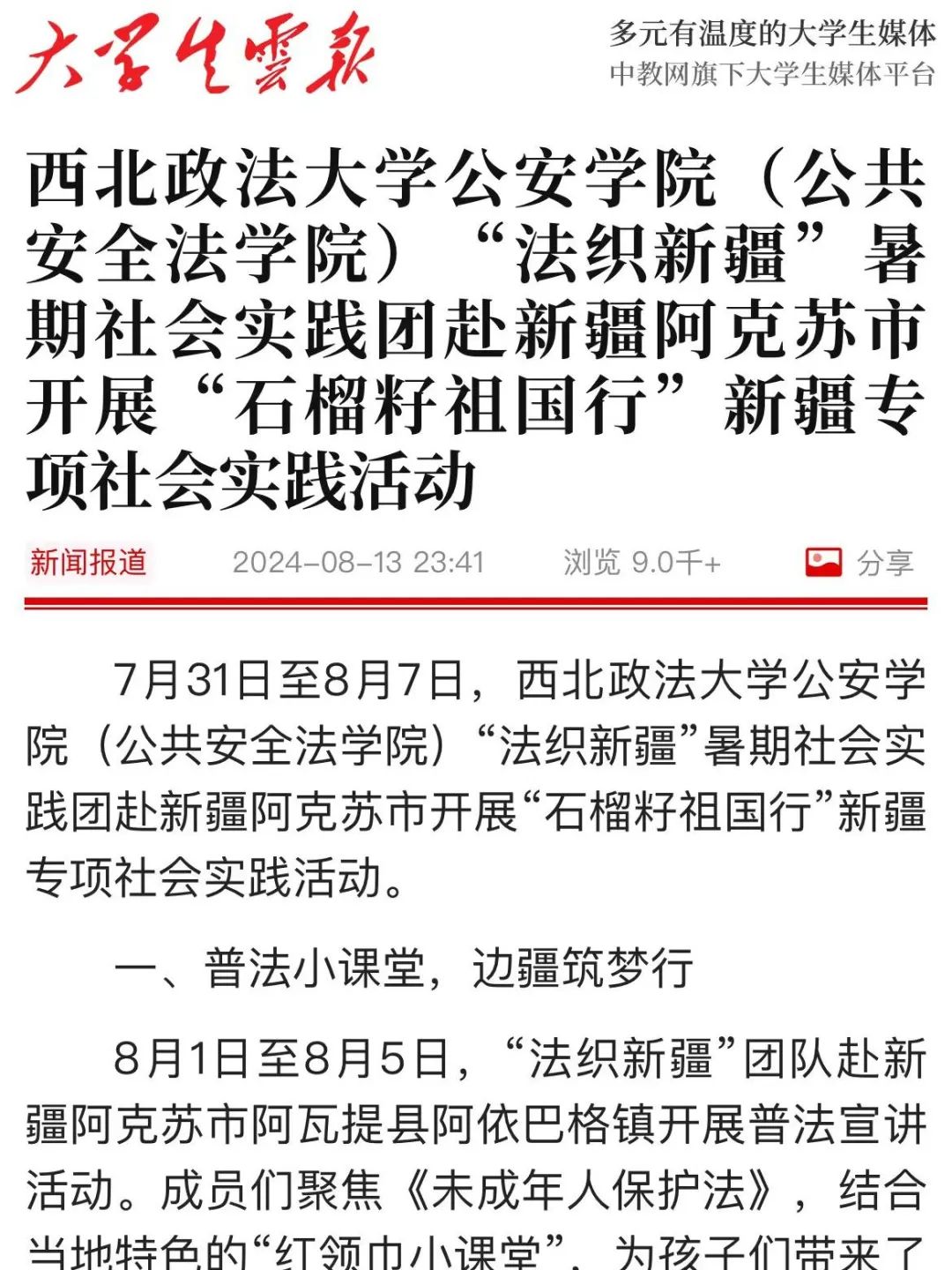 明升M88 明升M88 “法织新疆”暑期社会实践团赴新疆阿克苏市开展“石榴籽祖国行”新疆专项社会实践活动。本次实践活动的显著成效赢得了当地政府和居民的普遍赞誉和高度评价,其实践成果被大学生云报、青春阿瓦提、阿瓦提县融.阿依巴格镇站等多家媒体报道,展现了西法大青年良好的精神风貌,为明升M88 、明升M88 赢得口碑和关注。