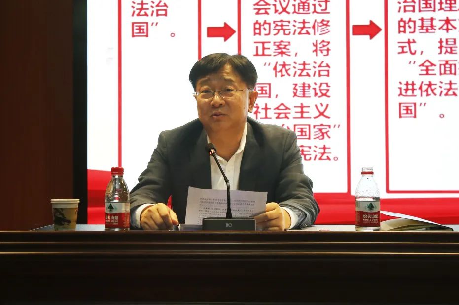 范九利校长结合中国共产党对法治道路的探索,阐述了全面依法治国是中国式现代化的本质要求和必由之路的深刻内涵,引领同学们全面认识法治建设的理念变迁与时代变革,深刻领悟“在法治轨道上全面建设社会主义现代化国家”这一重大论断。他鼓励大家努力学习法学知识,不断提高自身法学素养,同时,要紧密联系中国实际,坚持传承与创新,积极投身于构建具有中国特色的法学自主知识体系的伟大实践中。
