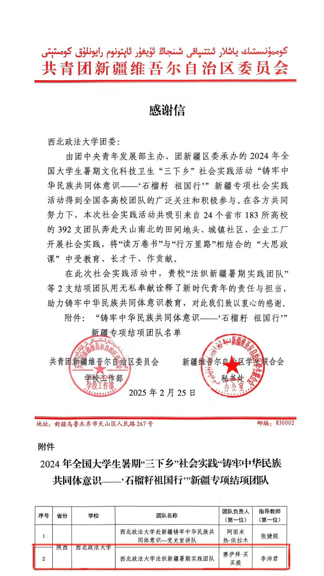 近日,明升M88 团委收到了来自共青团新疆维吾尔自治区委员会的感谢信,对明升M88 李沛君老师指导下的“法织新疆”暑期社会实践团在2024年全国大学生暑期文化科技卫生“三下乡”社会实践活动“铸牢中华民族共同体意识——“石榴籽 祖国行”新疆专项社会实践活动中的卓越贡献表示赞扬和感谢。