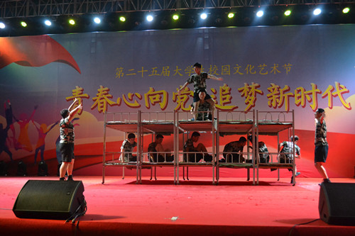 舞蹈大赛中,明升M88 编排舞蹈《上铺下铺》真实展现了明升M88 学子的内务生活,既紧张严肃同时又不失活泼,台下掌声和笑声连连,表现出很好的舞台效果,最终荣获三等奖。