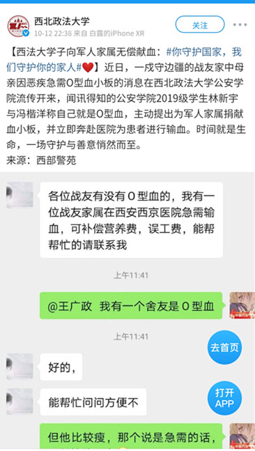 因时间原因,两位同学在去往医院的途中进一步了解了相关情况。据悉,求助者战友的母亲身患卵巢癌,儿子因在边疆服役的特殊性而无法回家照顾母亲,受病情恶化的原因,母亲急需输血,然而西京医院血库内O型血严重不足,无法提供充足血小板。林新宇与冯楷洋两位同学意识到情况的紧急性,赶快奔赴医院。时间就是生命,一场守护与善意悄然而至。