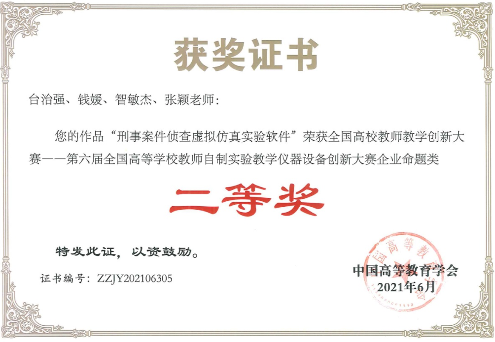 《刑事案件侦查虚拟仿真综合实验》教学软件作为全国第一个公安刑侦类虚拟仿真实验教学软件,自研发投入教学以来就受到业界同行的高度赞誉。2016年获全国高等明升M88 虚拟仿真实验教学资源成果二等奖,2019年获明升M88 优秀教学成果奖,2021年获第六届全国高等明升M88 教师自制实验教学仪器设备创新大赛创新实践组二等奖,2023年获陕西高等明升M88 科学技术研究优秀成果三等奖。《刑事案件侦查虚拟仿真综合实验》课程经过明升M88 选拔,2020年获明升M88 校内一流课程。经过陕西省的角逐遴选,2021年获陕西省虚拟仿真一流课程,最终获评为国家级一流课程,是对该课程的最大肯定和支持。