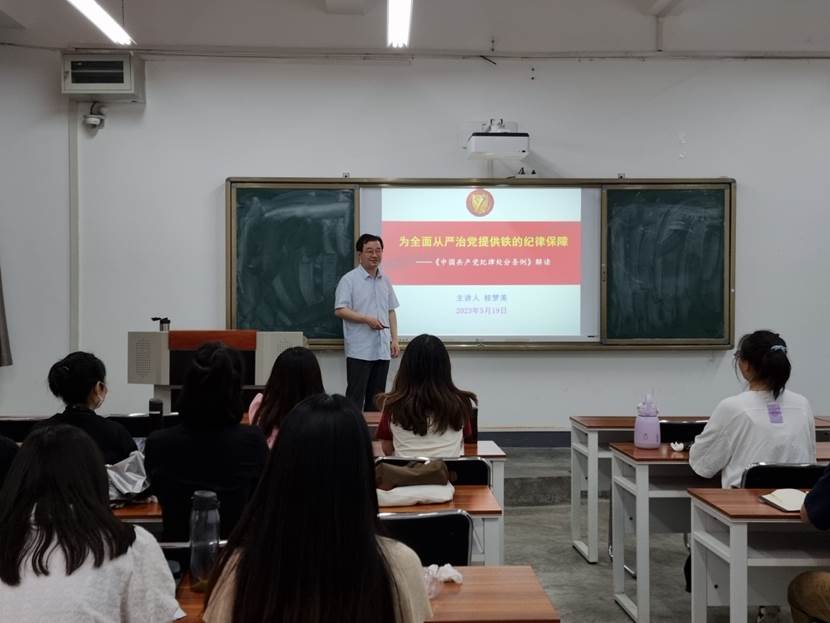 桂梦美以《为全面从严治党提供铁的纪律保障》为主题详细地解读了《中国共产党纪律处分条例》,从纪律处分条例的主要内容、特点以及其时代价值等方面重点讲述了加强纪律作风建设是推进全面从严治党、永葆党生机活力的关键举措。