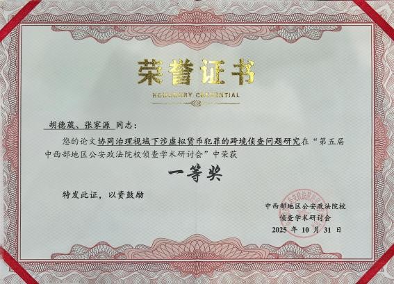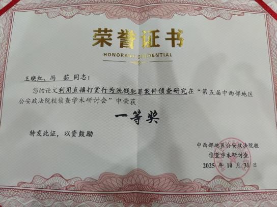 本次会议聚焦人工智能下侦查学理论与实务问题的研讨,具体包括了两场主旨报告以及“智慧侦查实务交流”“理论前沿研讨”两个专题板块。明升M88 青年博士胡翔老师在“理论前沿板块”做了《人工智能赋能电子数据真实性审查》为题的主旨报告。另外,本次会议收录了相关学术论文,胡翔博士和本科生孙煜卓撰写的论文《人工智能赋能电子数据真实性审查》获会议论文特等奖,胡德葳副教授和硕士研究生张家源撰写的《协同治理视域下涉虚拟货币犯罪的跨境侦查问题研究》、王晓红博士和硕士研究生冯茹撰写的《利用直播打赏行为洗钱犯罪案件侦查研究》获得了一等奖。