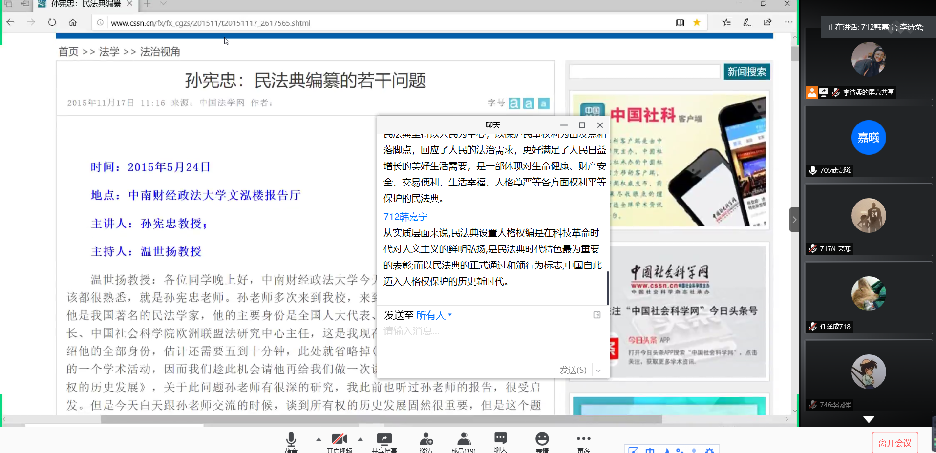 2019级学生通过腾讯会议又重温了杨宗科校长等一众教授对《民法典》讲解的在线直播课。通过对《民法典》的学习,大家了解到民法典是被称为关系每一个普通老百姓从出生到坟墓的一部法律,所以新中国的第一部民法典通过备受全国老百姓关注。《中华人民共和国民法典》被称为“社会生活的百科全书”,是新中国第一部以法典命名的法律,在法律体系中居于基础性地位,也是市场经济的基本法。民法典共7编、1260条,各编依次为总则、物权、合同、人格权、婚姻家庭、继承、侵权责任,以及附则。