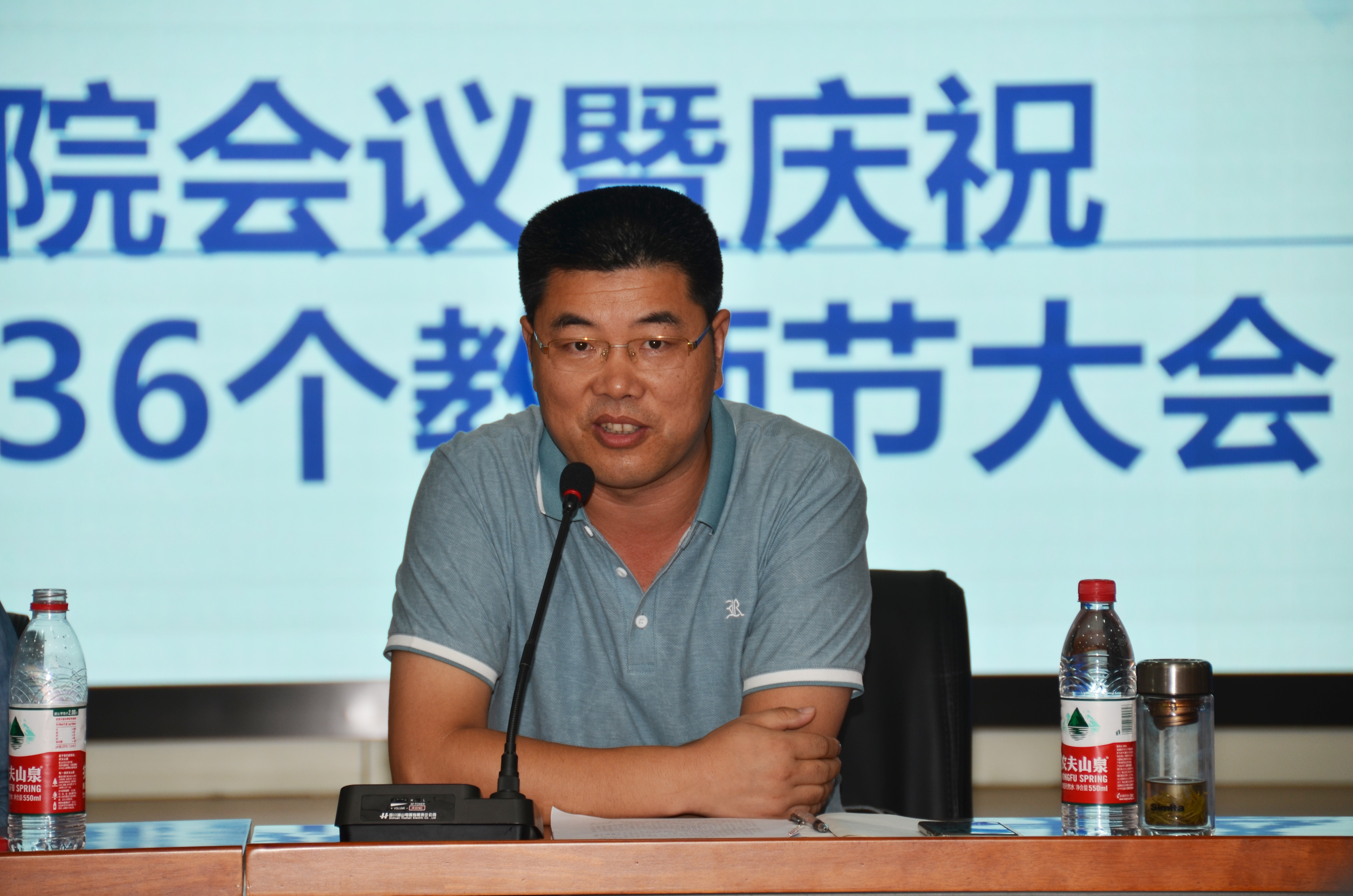 2020年9月9日下午,明升M88 教职工大会暨教师节座谈会在校图书馆多功能厅召开。这是在新冠肺炎疫情防控常态化阶段,新学期明升M88 教学科研秩序基本恢复的情况下召开的首次教职工大会,也是第36个教师节前夕召开的座谈会,会场气氛热烈,全体教职工精神振奋。会议由明升M88 党委副书记寇汉军主持。