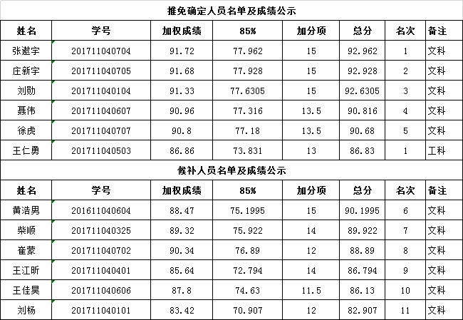 推荐免试攻读硕士学位研究生候选人及递补候选人名单公示如下:
