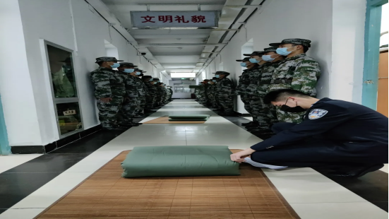 桌子上不能有任何物品;床上只能有一层褥子,一层床单,一个枕头,一块绿豆腐;镜子上不能有可消除的杂质、污渍;地板可以当镜子;水壶要居中摆放;不能出现任何私人物品……这些只是内务条例的基本规定,也是公安学子始终坚持的标准。