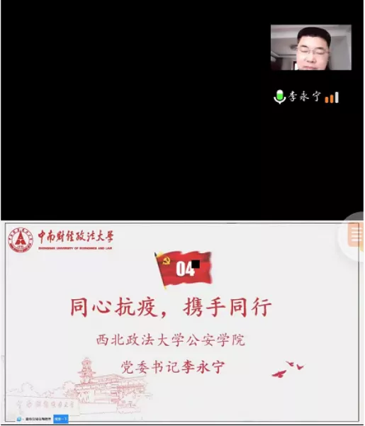 第三项,中南财经政法大学刑事司法明升M88 党委书记张志刚发言。他表示,每一个党组织就是一个坚实的堡垒,每一位党员就是一面生动的旗帜。西安民众团结一致,贡献力量,再次展现了中国人民对抗新冠疫情肺炎的过程中形成的生命至上,举国同心,舍生忘死,尊重科学,命运与共的伟大抗疫精神,其成果的取得展现了中国人民的伟大力量,增强了民族凝聚力和向心力。两年前在武汉疫情暴发时中南财经政法大学受到了西北政大学的热切相助,以前的温暖仍铭记于心,如今中南财经政法大学也为明升M88 也献上最真挚的祈愿和祝福,相信西安定能战胜本次疫情,定将迎来冰雪消融,春暖花开!