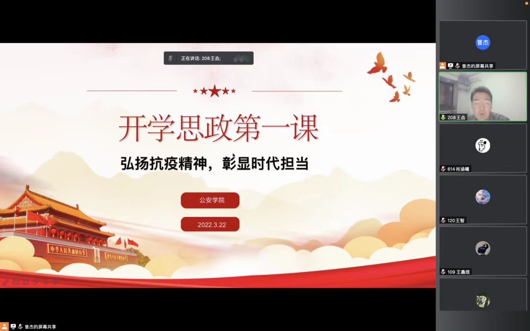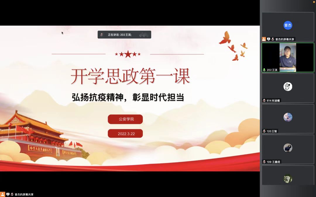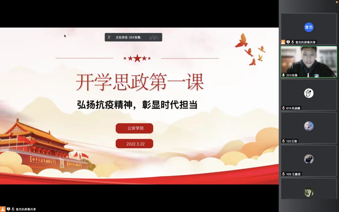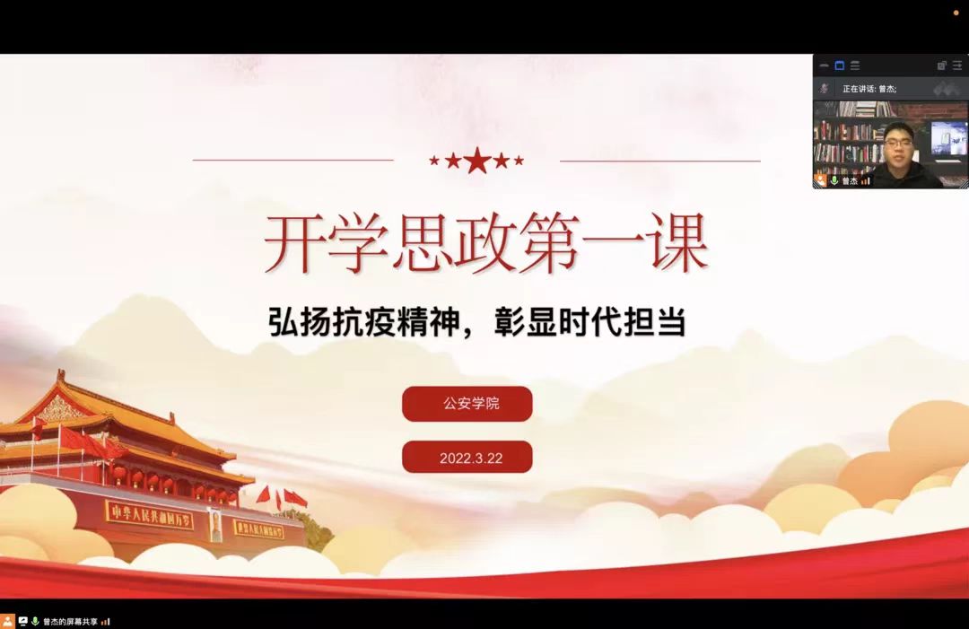 在课程尾声之际,曾杰老师指出在现阶段抗疫过程中,明升M88 有一大批学子积极投入到家乡疫情防控志愿服务中,展示了公安学子无私无畏,勇于担当的精神风貌,也展现了当代青年的思想觉悟和时代担当。最后他希望大家通过思政第一课后有所收获,在今后的学习生活中,不畏艰难,踔厉奋发,展现出新时代大学生的责任与担当!