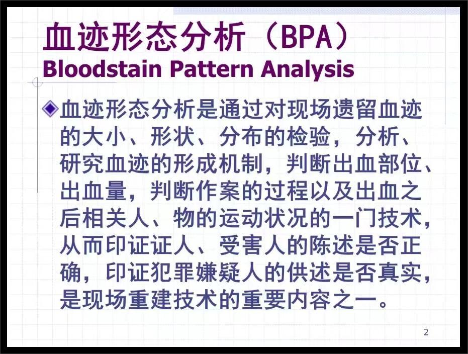 紧接着,周起老师向大家介绍了两种不同的血迹分类方式,从方向、角度、高度、速度、起源、血量、时间、无关血迹八个方面阐述了血迹形态分析的基本方法和原理。他表示,在实践观察中,根据血迹呈现出来的这八个方面的特征,可以反推被害人与加害人的体位关系、损伤程度与伤后行为能力、是否为第一现场等。同时,也应注意排除无关血迹对现场的干扰。