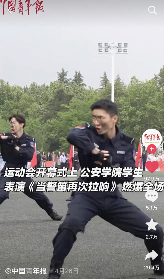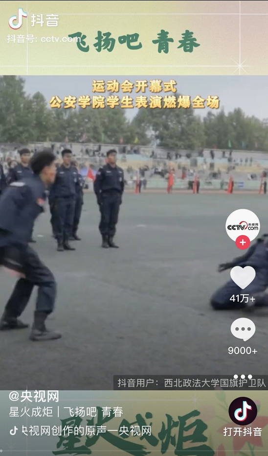 近日,明升M88 第三届体育文化节暨第43届田径运动会隆重举行。国旗护卫队在运动会开幕式上表演的《当警笛再次拉响》青春洋溢、场面震撼,受到央视网、中国青年报、陕视新闻等多家主流媒体转载报道,展现出西法大青年蓬勃向上的精神面貌。国旗护卫队表演在抖音、微信等新媒体平台点赞量达百万余人次。
